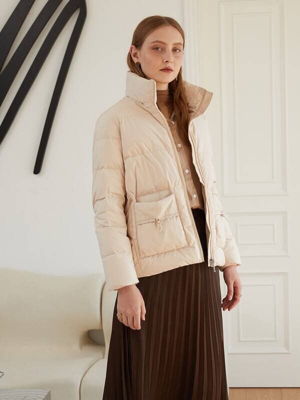 冬はどうしても黒のダウンを選びがちですが、明るいベージュを選べば重くならずに軽やかな印象に。