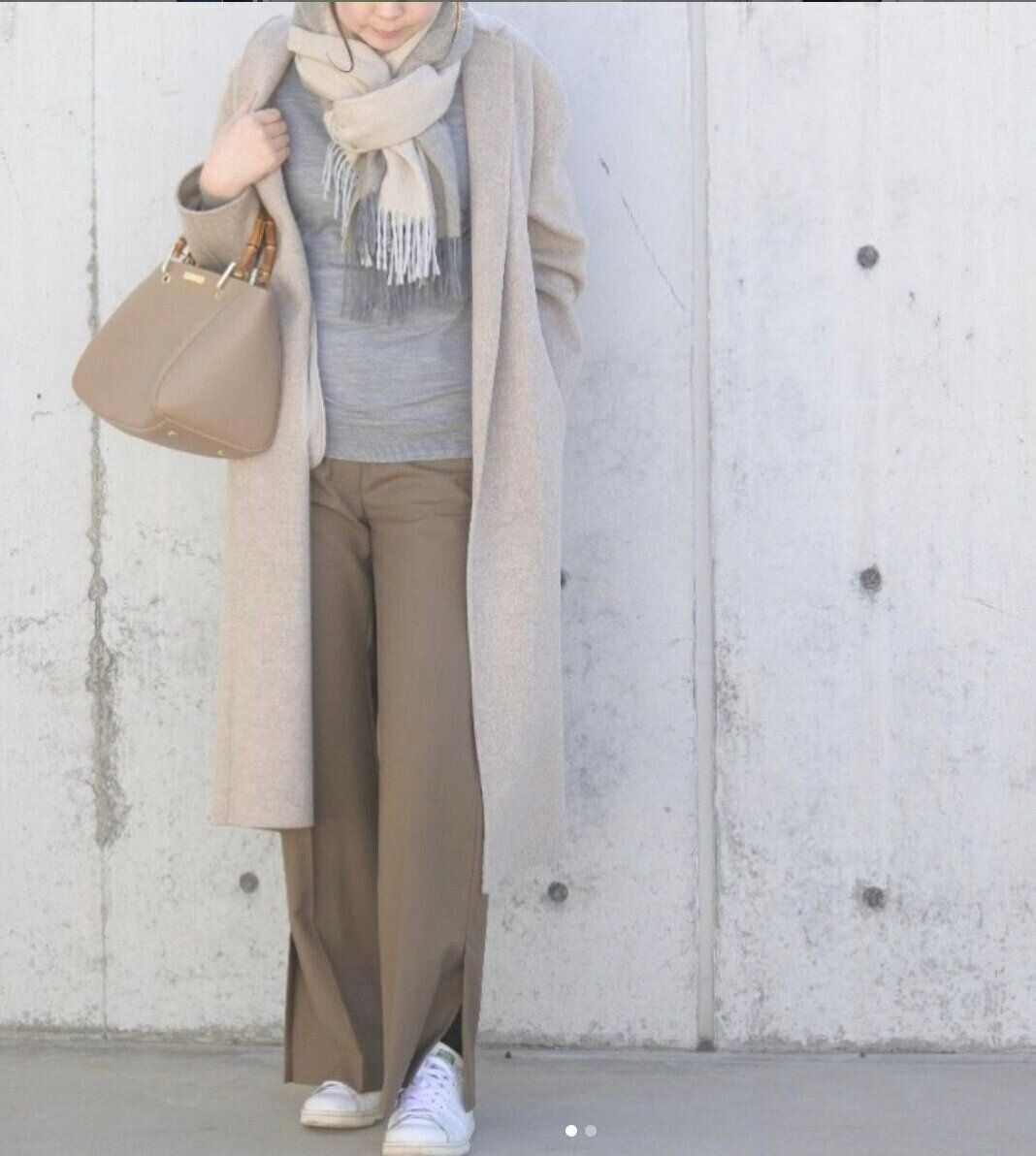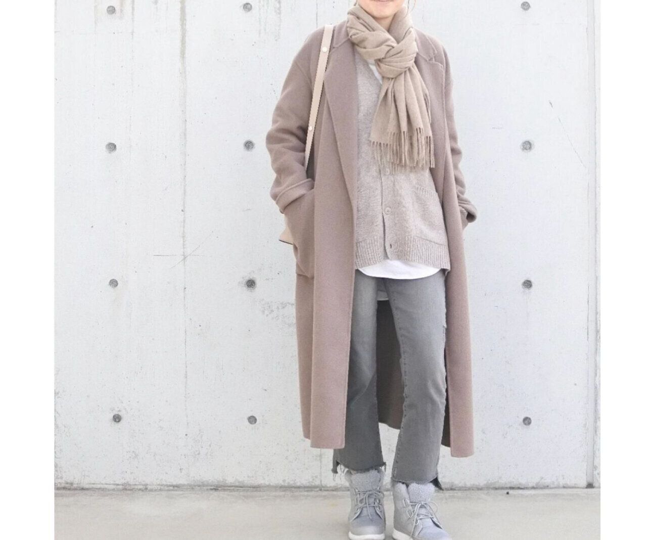 もこもこブーツはほっこりカジュアルにならないよう、きれいめのウールコートと合わせるのがポイントです。