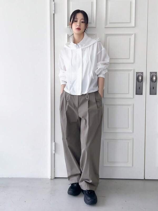 コンパクトなパーカージャケットには、ワイドパンツを合わせてカッコよく決めるのもおすすめ!袖を上げておくと、手首が見えて華奢見えします。