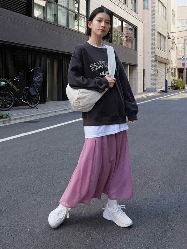 英文字プリントのスウェットに、ピンクのロングスカートを合わせたコーデは大人カジュアルな印象に!インナーにホワイトのTシャツを入れることで、小物のカラーとリンクし抜け感が出来ます。