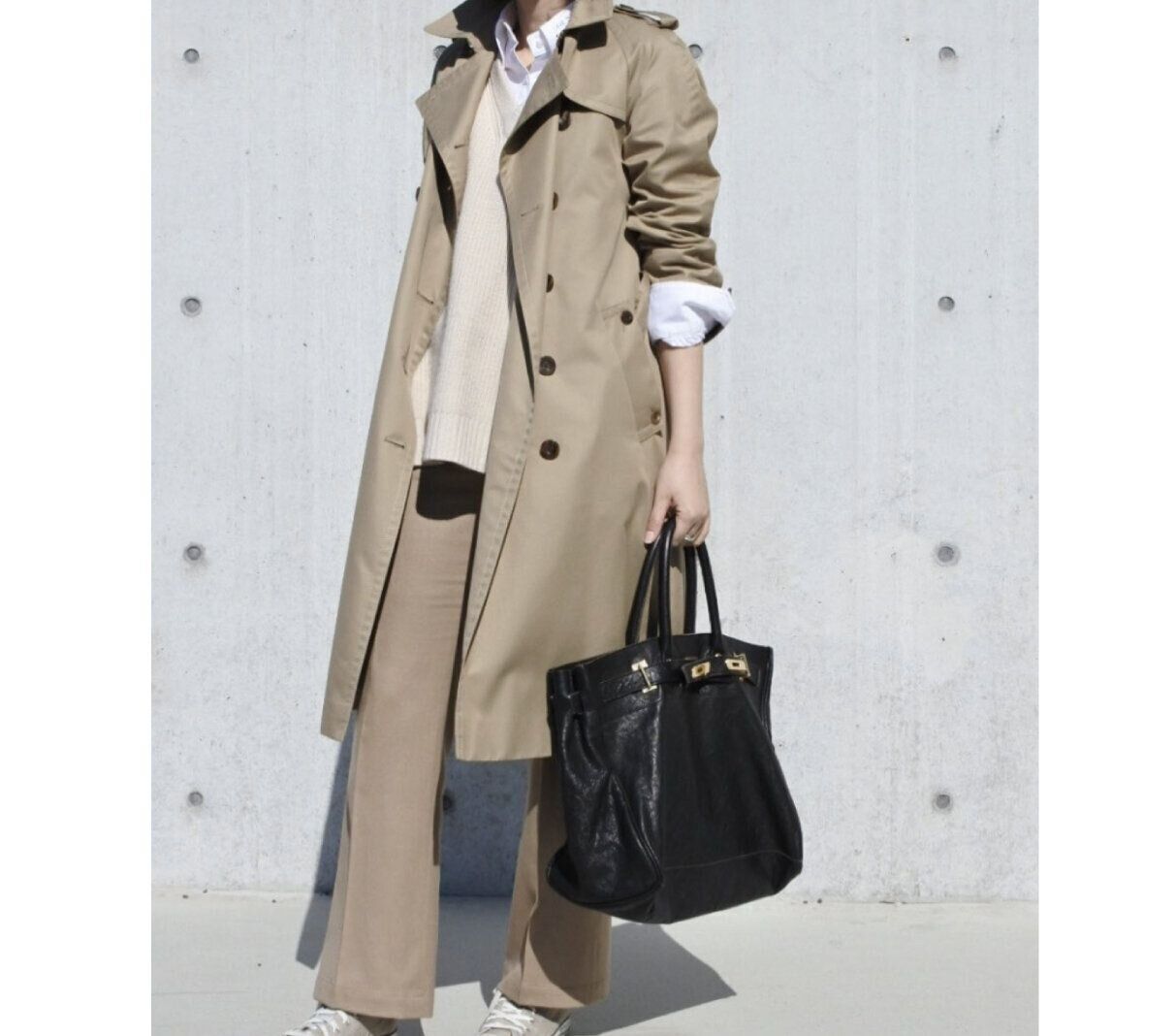 雨の日は肌寒く感じるのでトレンチコートでしっかり防寒。