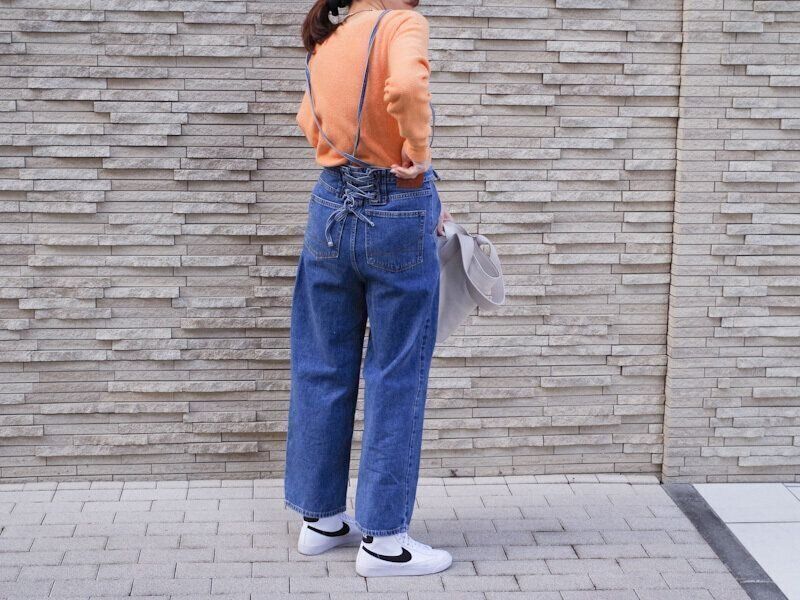 オレンジ色のコットンニットに、サロペットを合わせました。足元は、アクティブな印象がやどる、ハイカットシューズをひとつ。アウターはトレンチでもマウンテンパーカーでも合わせやすい万能スタイルです。