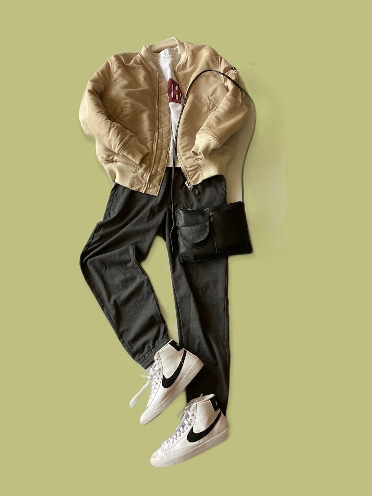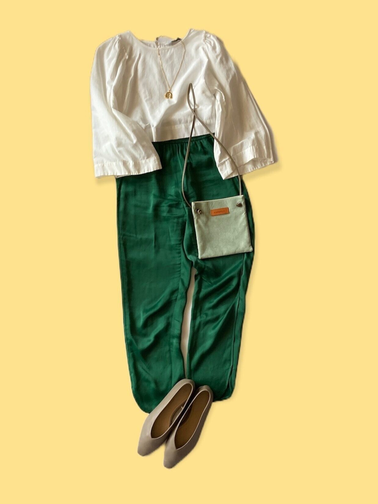 ハッと目の覚めるグリーンのサテンパンツを主軸にしたカラーコーディネート。サラッとした生地感の素材を選んでジメジメとした気候でも心地よくすごせます。スッキリ見える着丈の短いブラウスを持ってくると全身バランスがまとまって◎。