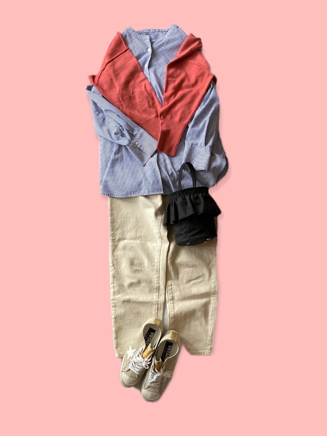お出かけが楽しくなる晴れの日は、ウキウキとした気分を後押ししてくれるピンク色をコーディネートにチョイス。定番のボーダー×デニムコーデでも気分が上がります。