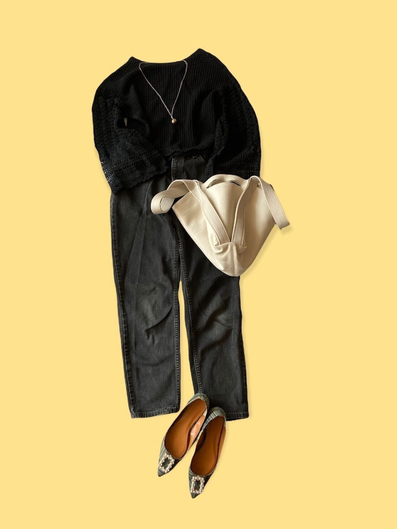 オールブラックでは、透け感のあるレース素材のブラウスを選ぶと、重たく見えず着こなすことができます。上品さを後押しするパールのポインテッドトゥパンプスに、直線的なラインが印象的なバッグを合わせてモダンな雰囲気に。継続して注目されるブラックコーデを、イチ早くモノにしてみましょう。