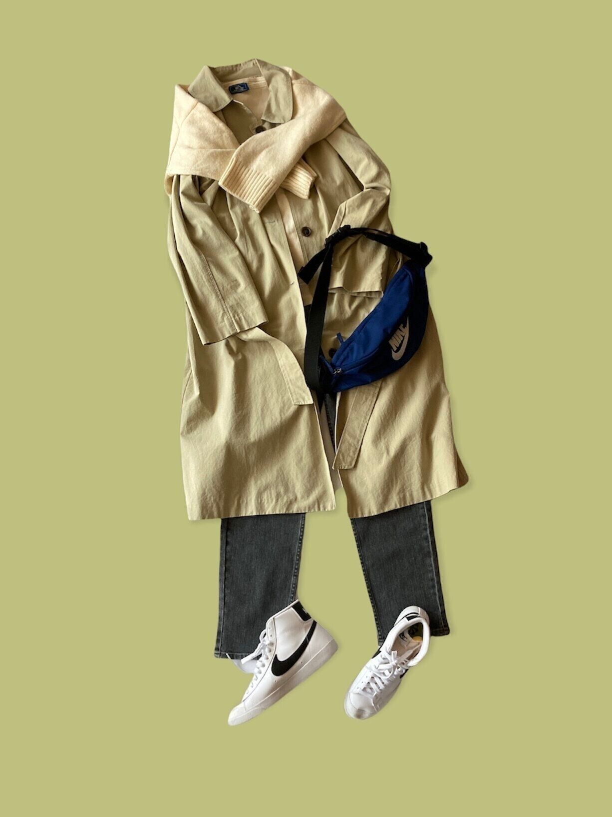 風を冷たく感じる曇りの日には、ニットの肩かけで寒さをしのいで。ニットの肩かけをすると、オシャレさがアピールされるだけでなく、背中がポカポカと暖かくなります。まだ、馴染みのない人は、まずはトレンチコートと同じトーンのニットを肩かけしてみましょう。上半身が立体的になるだけで、いつもと違った雰囲気に。