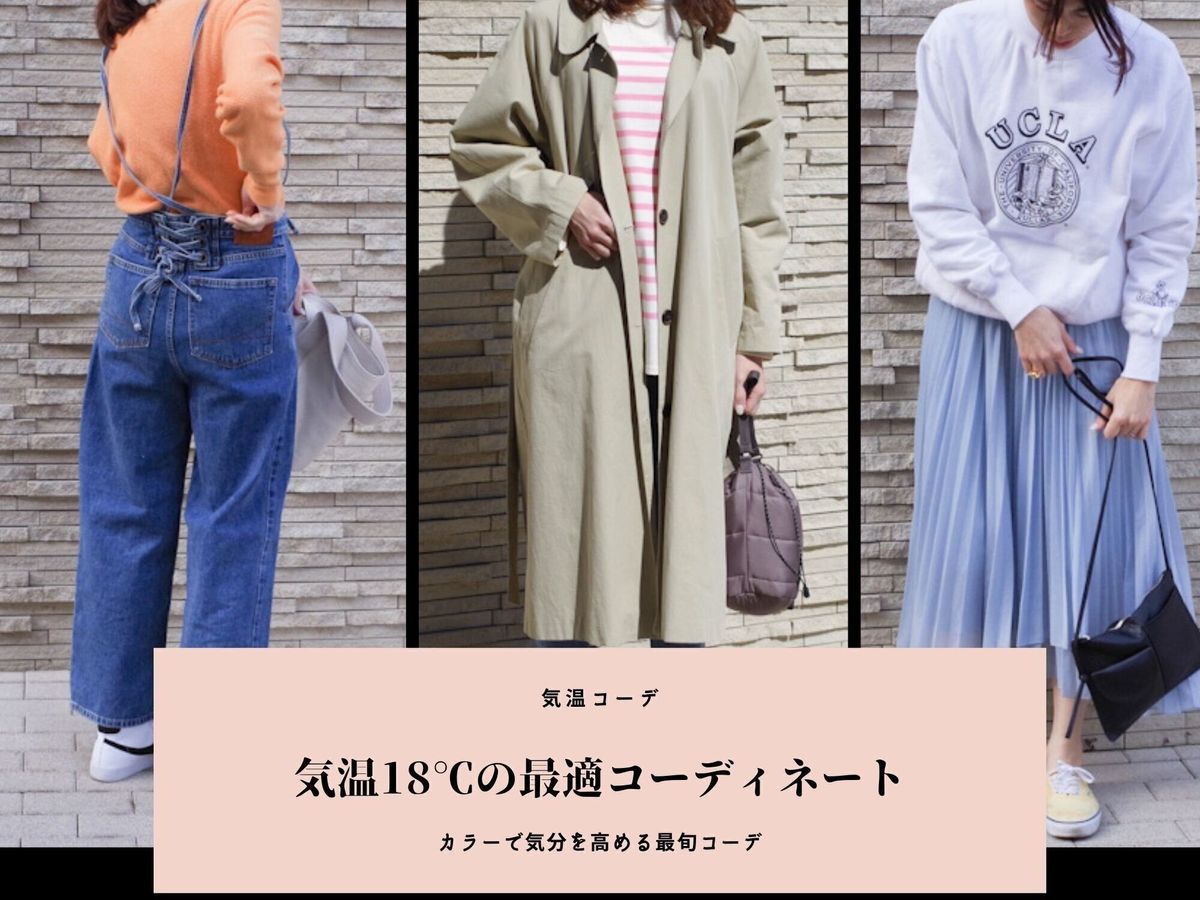 同じ「18度」でも、その季節がいつなのかで身に着けるべきアイテムが変わります。春ならば、ボルドーよりパステルカラーを選びましょう。ただ、春=パステルカラーは定番すぎるので、少しだけ強めのアクセントカラーを取り入れるのもオススメ。強いカラーを投入することで、鮮度が加わるスタイリングに。