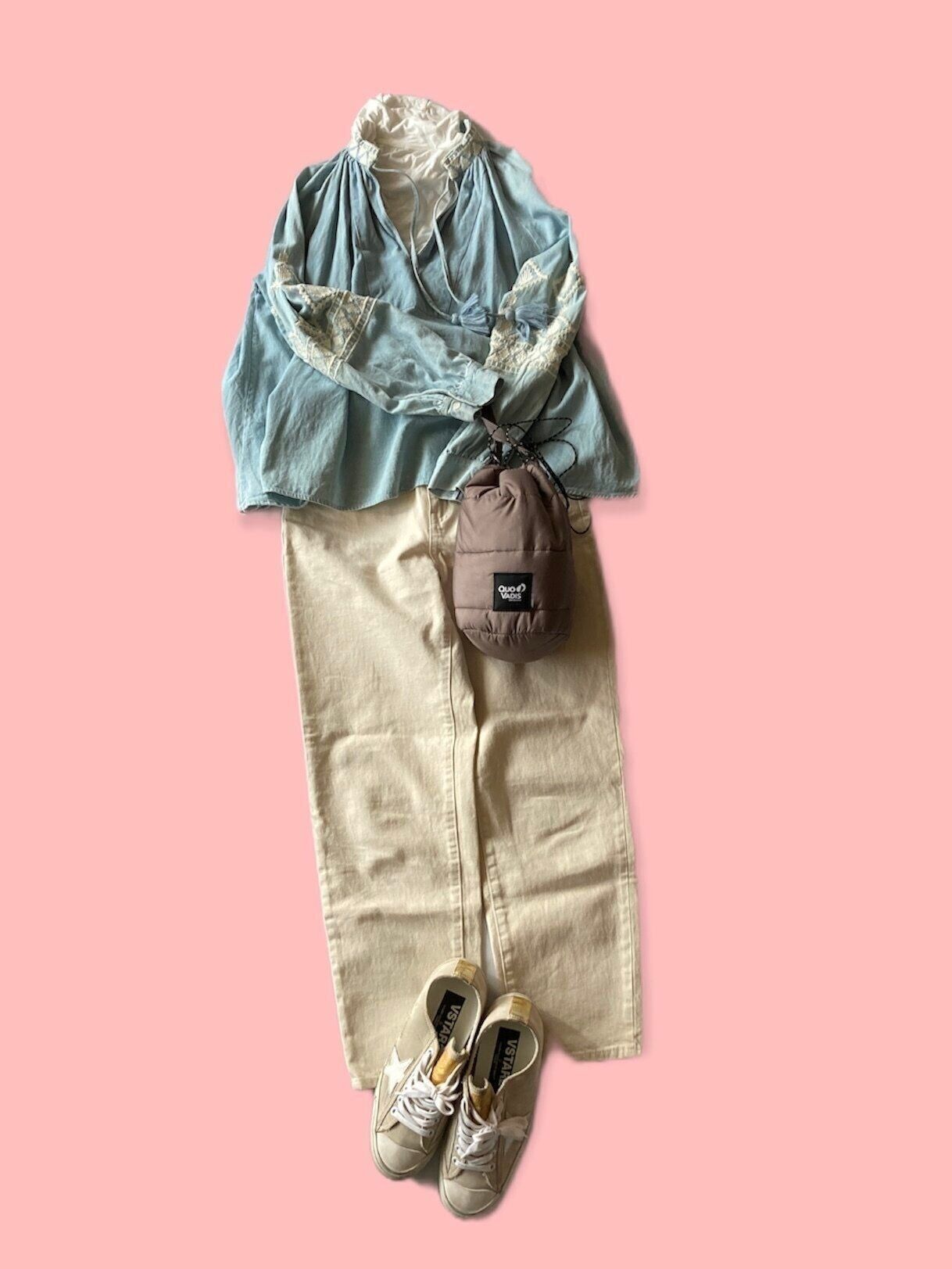 刺繍入りのデニムトップスは、春へ向かう18度前後の気候で手に取りたくなります。首元の開いたデザインなので、インナーにハイネックを合わせて風を防いで。パンツスタイルでも、しっかり着映え感があり、お花見や春のお出かけが似合うスタイルに。