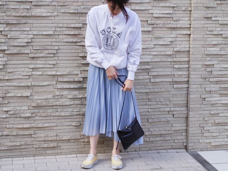 すっかりおなじみになったプリーツスカートは、裾に動きのあるデザインを選んで更新感をアピール。こちらは、ランダムな裾のデザインで、奥行きが出せるプリーツスカートです。定番カジュアルともいえる、薄手のスウェットにスカート、スニーカーコーデに、“新しさ”を注入してみましょう。