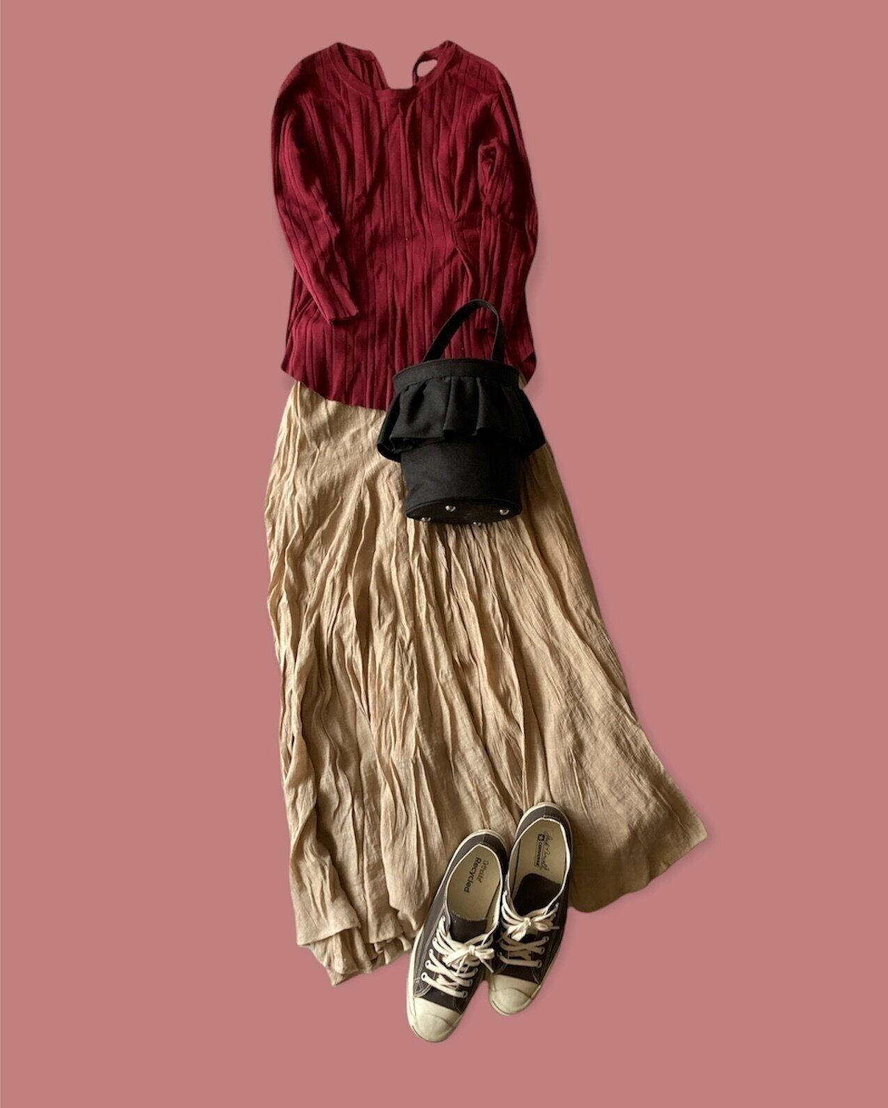 秋初旬に身に着けたくなるボルドーカラーは、カットソー素材で取り入れると、9月~10月に重宝します。ボトムには、軽さのあるマキシスカートでカットソーとのバランスをとって。