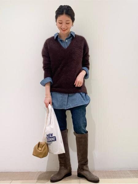 トレンドのロングブーツ。太めでヒールの高すぎないものを選ぶことで簡単に今っぽいスタイルに。