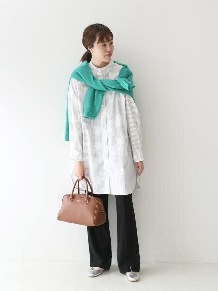 春らしさを感じさせるストライプシャツ。インナーとボトムのカラーを統一することで、コーデがピシッと決まりますよ!