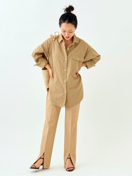 スリット入りのパンツは抜け感が出て美脚見えも叶う優秀アイテム。センタープレスが入っていることでよりスッキリとした印象に。