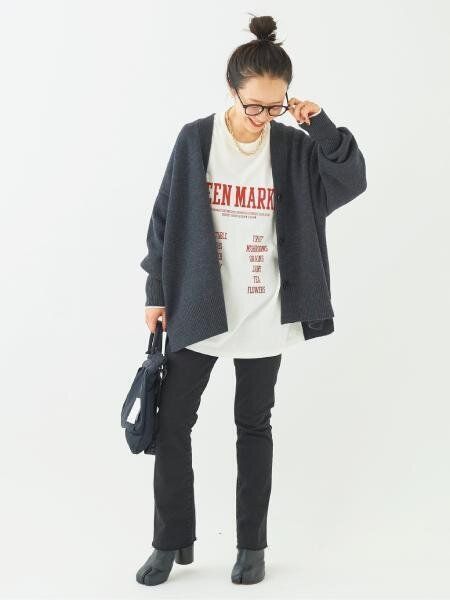 定番のニットカーディガンも鮮やかな色をチョイスするとまわりと差をつけることができます。全体にゆとりがあるデザインとサイズ感なので、抜け感も出て◎。