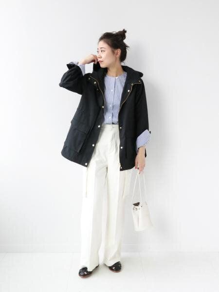 晴れの日は白を取り入れるだけでさわやかな春コーデに。パンツにセンタープレスが入っていることでゆったりとしたシルエットでもきれいめな印象になります。