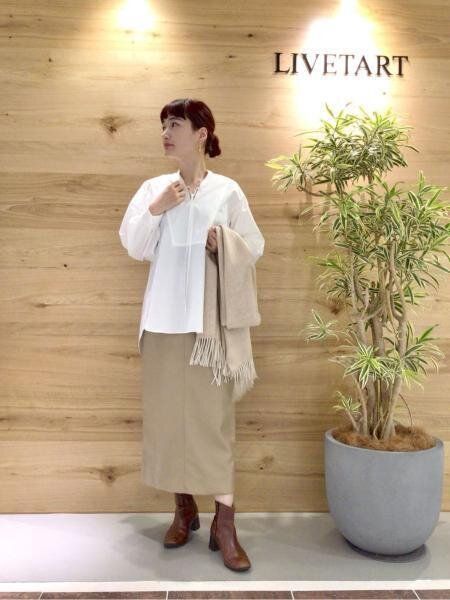 こちらのシャツブラウスは、柔らかい手ざわりで涼しげに着こなせます。長めの着丈とオーバーなシルエットが、さらに秋らしさを引き立てますよ。