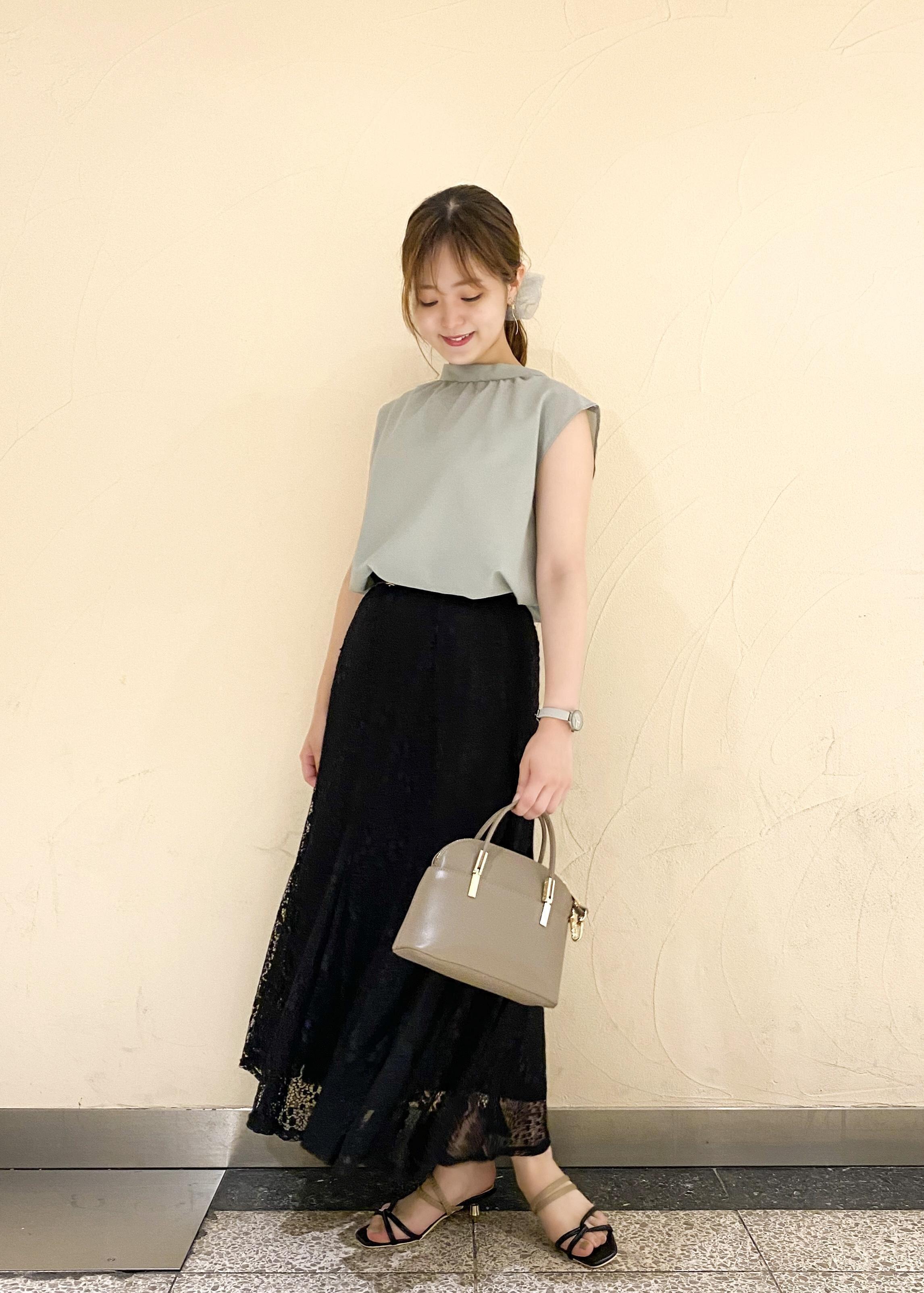 トップスにとろみ素材、ボトムスにレース素材で合わせたフェミニンコーデ。色味を抑えることで大人っぽい印象に。