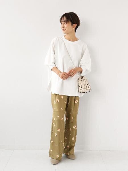 プリントパンツを主役にしたコーデ。花柄が小さめで派手すぎず大人女性でも日常使いしやすい柄です。