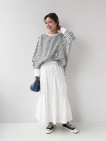 晴れの日だからこそ楽しめる白のティアードスカートで女性らしいコーデを。トップスにゆるいボーダーカットソーを合わせることで、スカートのフェミニンさが中和されて、ほどよいカジュアルスタイルに。