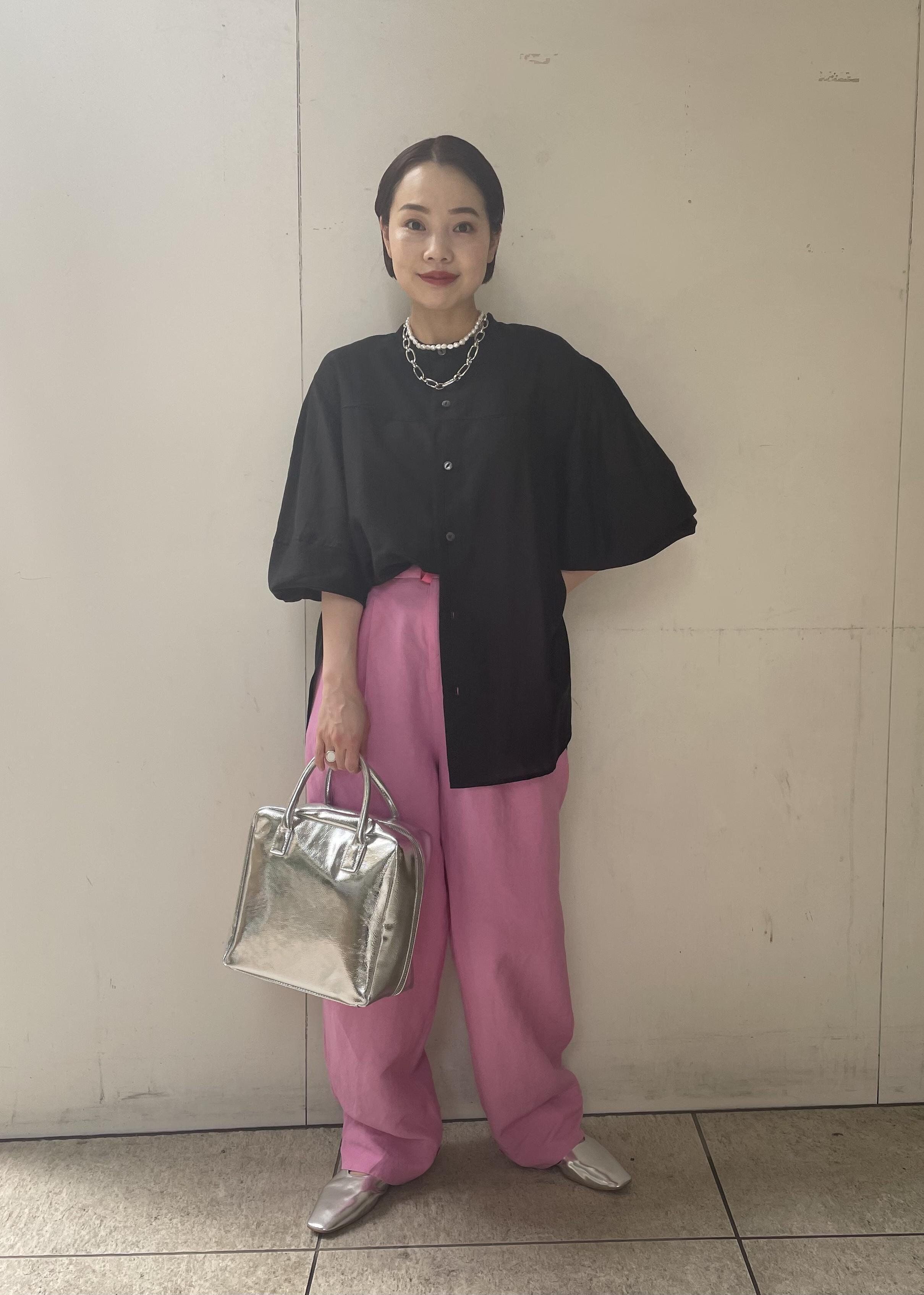 青みピンクのパンツを主役にしたコーデ。黒のブラウスを合わせることで、甘すぎず洗練された大人コーデに。