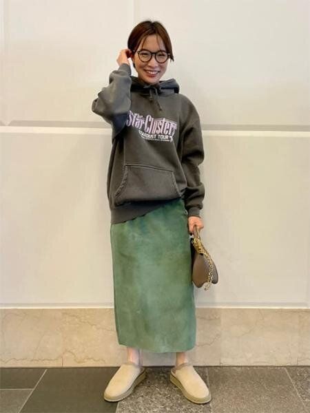 重たくなりがちな秋コーデの主役になるカラースカート。スウェットと合わせることで、キレイ目な印象になりすぎず、肩の力の抜けたほどよい大人カジュアルスタイルになります。