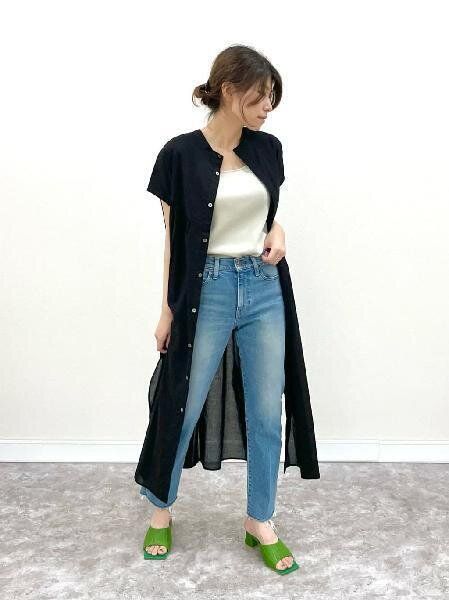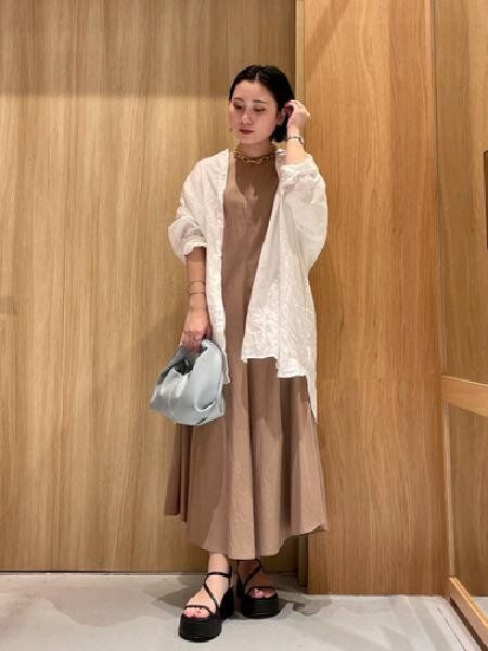 薄くて軽いシャツワンピースは夏の羽織に最適。ロング丈のものを選ぶことで、お腹や尻まわりもオシャレに体型カバーできます。