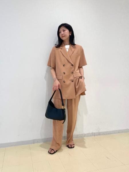 マニッシュな印象のジャケットも、ベージュピンクカラーを選ぶことで優しげな印象に。夏場のオフィススタイルにもおすすめです。