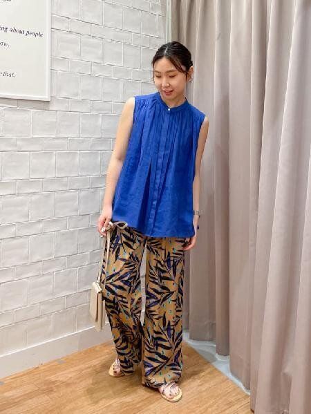 涼しげなリネンブラウスで夏らしいスタイルに。ボトムにはゆったりとしたシルエットのパンツを合わせることで、よりリラックス感のある夏のオフコーデになります。