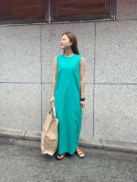 晴れの日は夏らしいターコイズカラーのワンピースで1枚でコーデが決まるスタイルに。ジュート素材のバッグを合わせることでリラックス感をプラス。