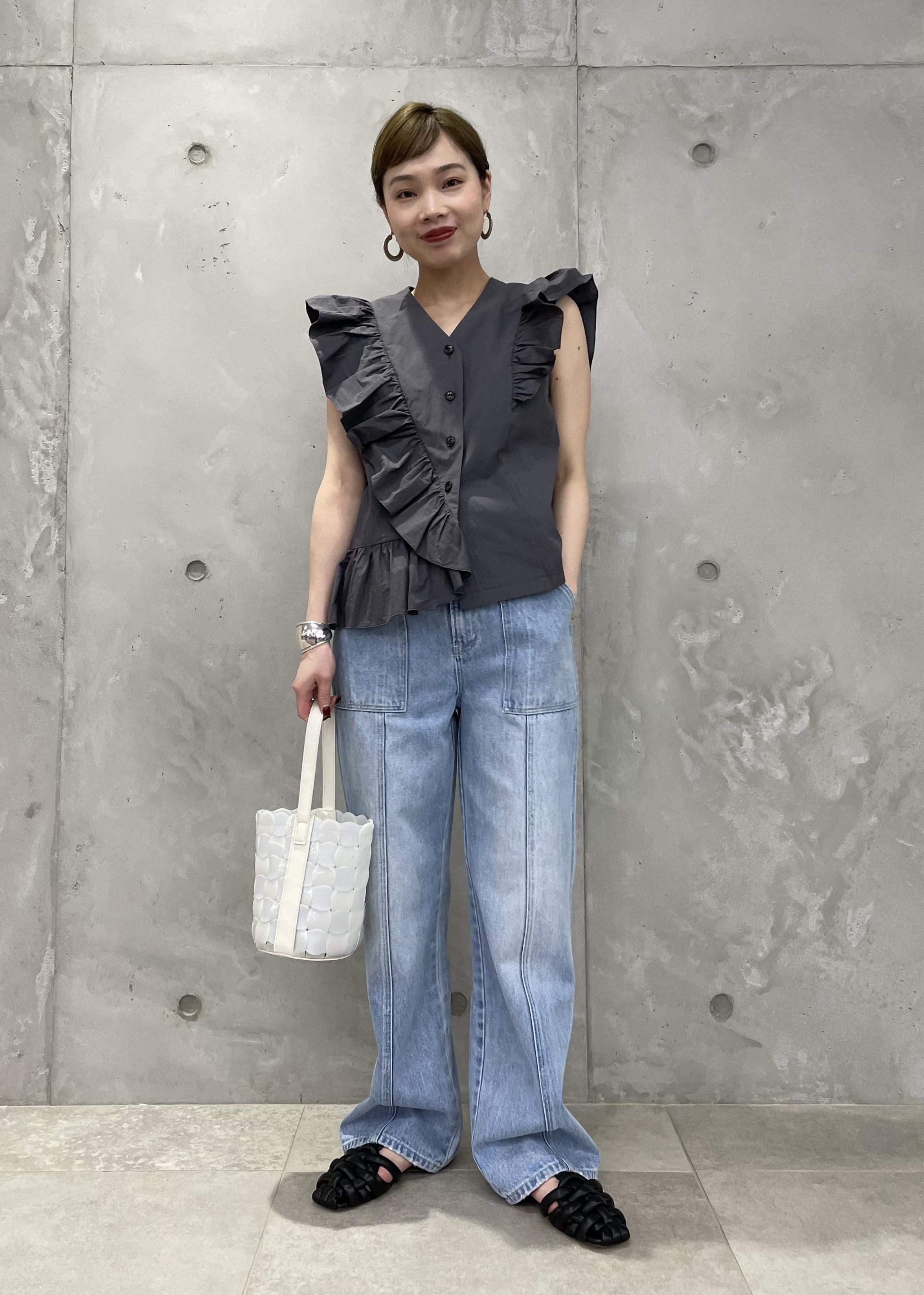 甘い印象になりがちなブラウスもデニムと合わせることでほどよくカジュアルダウン。また、色味はベーシックカラーでまとめることでより落ち着いた印象になります。