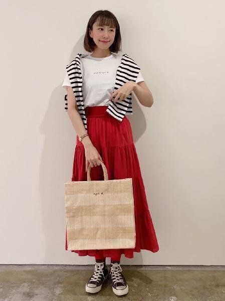 全身の配色を赤白黒でまとめれば簡単にフレンチシックなコーデに。ラフィア素材のバッグを合わせることでより夏らしいスタイルになります。
