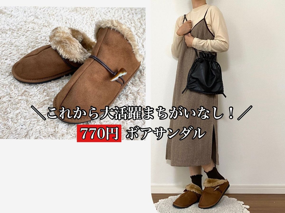 そんなチラシ商品の中から見つけたのは寒くなってきた今時期大活躍!ちょっとそこまでにはもちろんお出かけにも履いていけちゃう770円のボアサンダルをご紹介します。