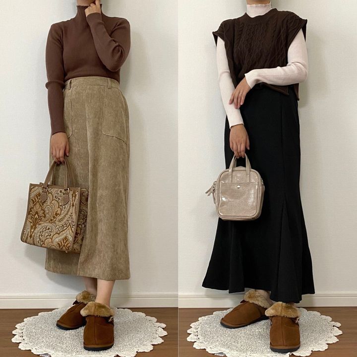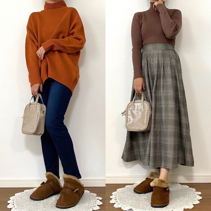 存在感のあるアイテムですが、季節感のある同じブラウンのアイテムとカラーをリンクさせてコーディネートするとよりコーデに馴染みやすいかなと思います。