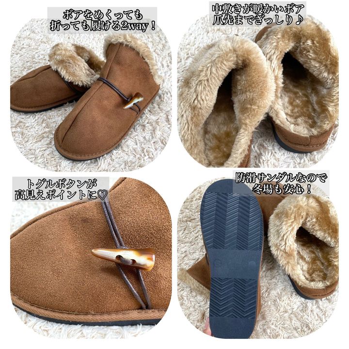 広告の品のボアサンダルです。履き口のボアの部分はめくっても折り返しても履ける2way仕様。