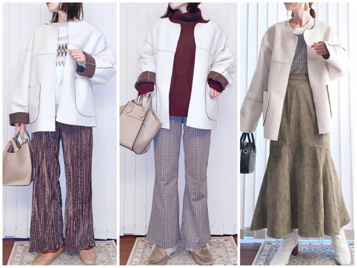 ボア素材の方はアイボリーなので、どんなアイテムとも合わせやすいです。こちらも求心柄やワッフルボーダー柄ニットとも合わせやすく、濃い目のカラーニットと合わせるのも可愛いです。
