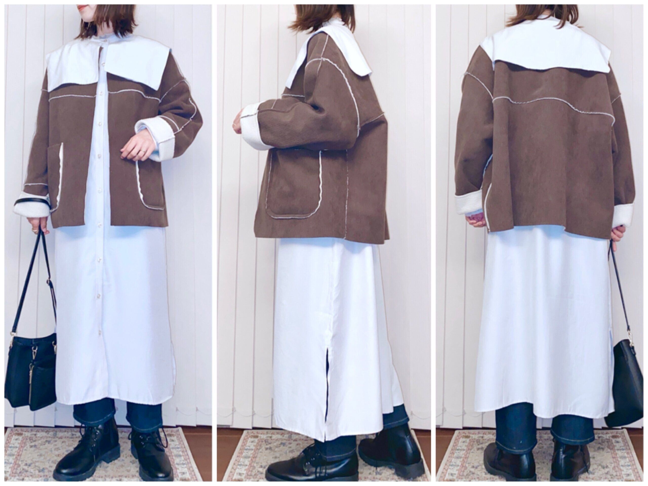 トレンドのセーラーカラーワンピースと合わせてみました。背中や袖、ポケットなど、切り替えラインの部分にボアの配色がアクセントになっていて360℃とっても可愛いです。