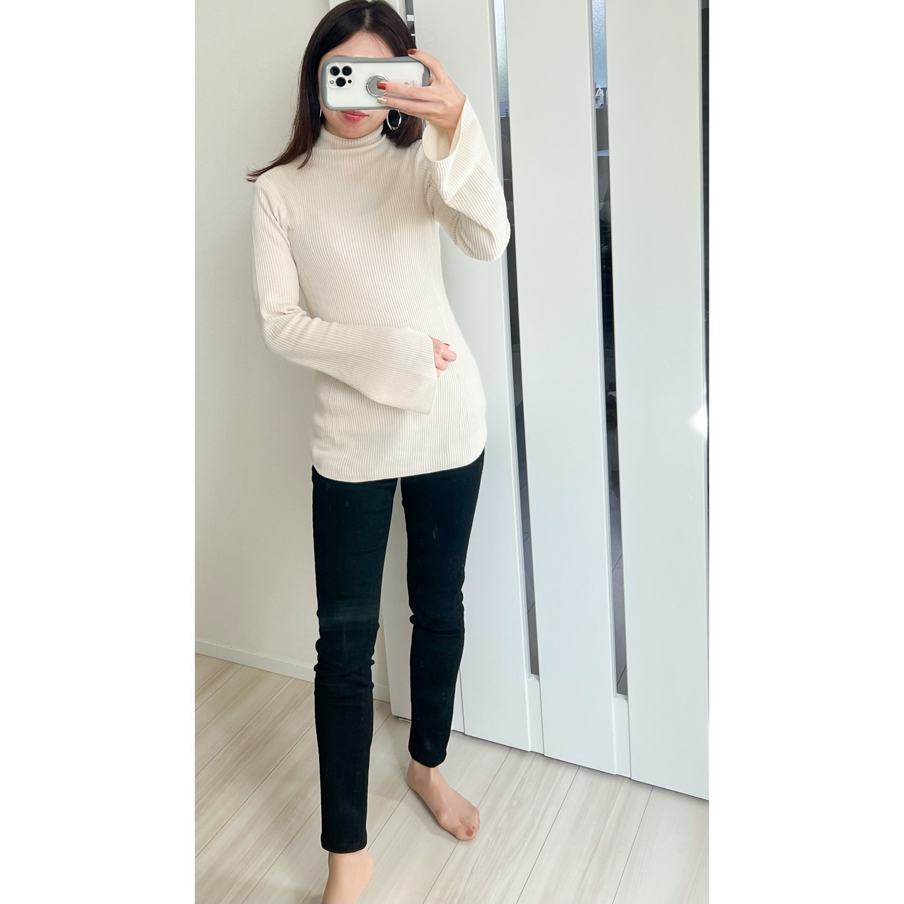 ちなみに写真のボトムスは、ユニクロの「ヒートテックウルトラストレッチハイライズジーンズ」。とても暖かくて、テレワークの時は毎日履いています。24インチで丈詰めしました。