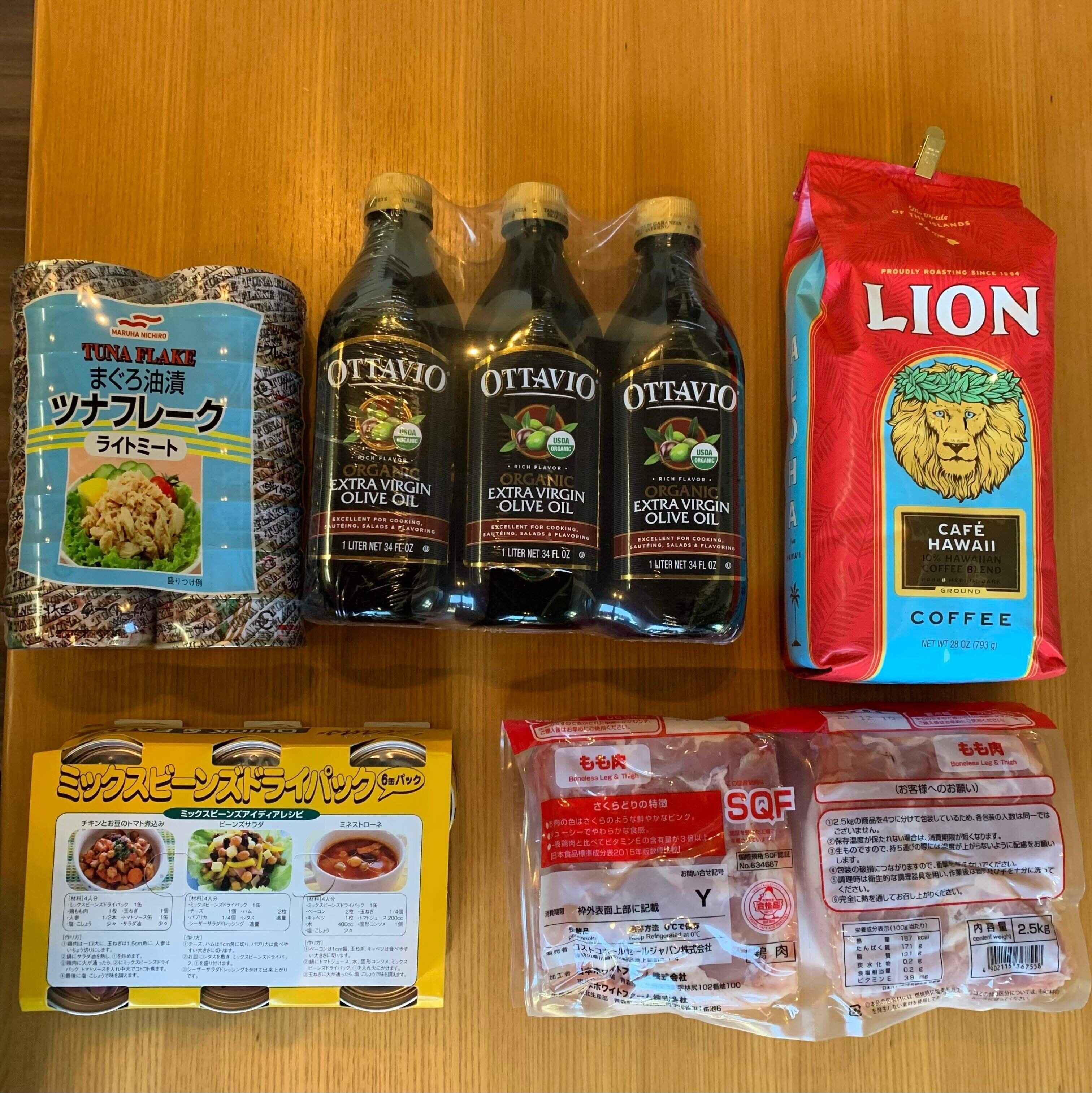 ツナ缶、ビーンズ缶、鶏もも肉、オリーブオイル、コーヒーは、ふだんから、スーパーでも買うものばかりです。消費量が多いので、まとめて買いました。