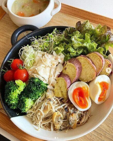 今朝のメニューは、ボリュームたっぷりのサラダプレートにお味噌汁をつけて。材料は、キャベツ、ブロッコリースプラウト、グリーンリーフ、ミニトマト、ブロッコリー、大根の酢漬け、えのき、あさり、ゆで卵、さつまいも、人参、玉ねぎ、ねぎ。きのこや酢漬けは「腸活」にもってこいの食材。温かいお味噌汁をつけることで栄養バランスが整うだけでなく、体もホッとできそうですね。