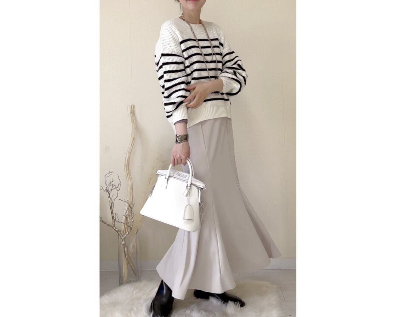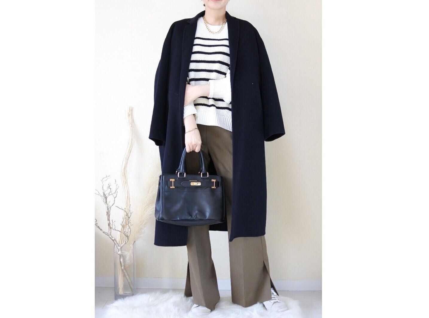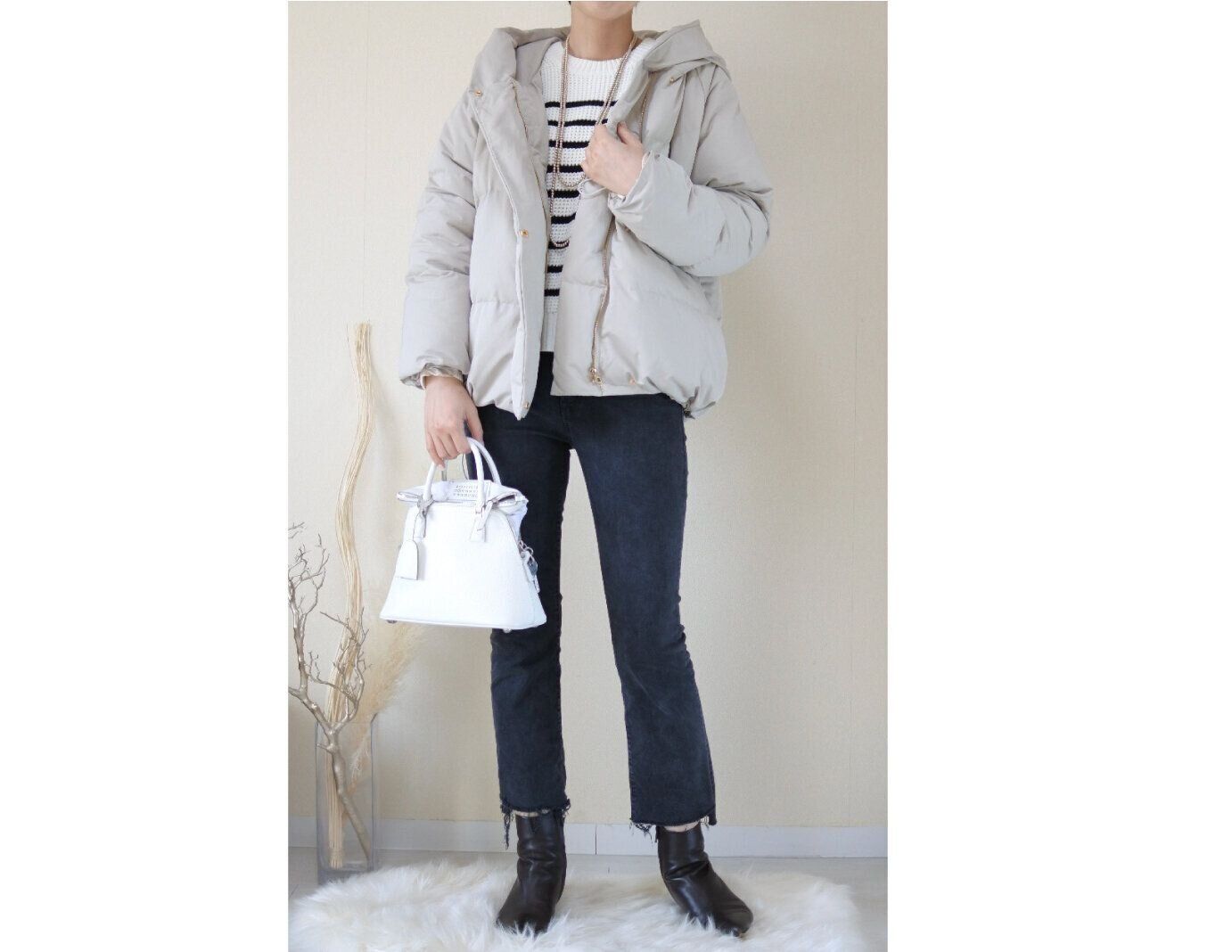 靴やバッグを白にするなど、どこかに白を取り入れるのが冬服を重たく見せない重要なポイントです。
