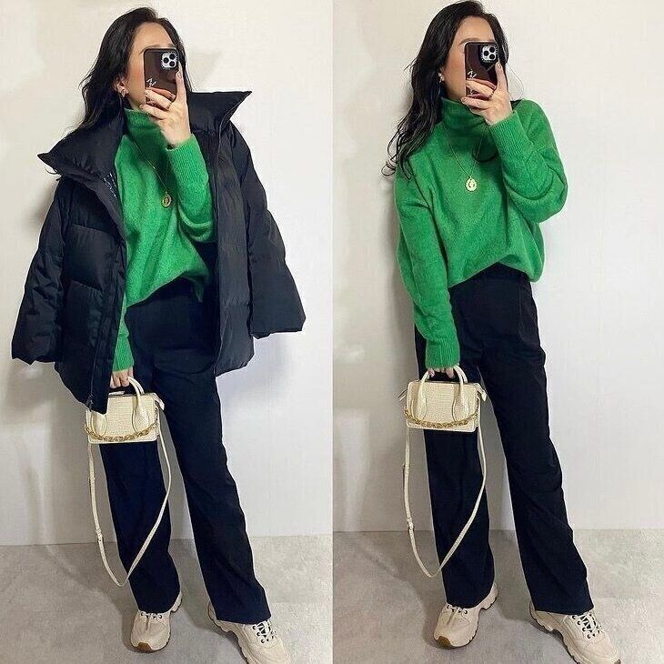 黒のダウンを選ぶ人も多そうですよね。無難に見せないために、インナーには発色のいいカラーニットをオン!白小物で統一させれば、よりクリーンなムードに。パキッとした配色でフレッシュな印象を残すことができます。