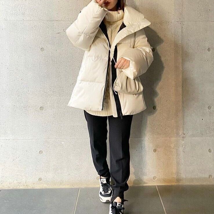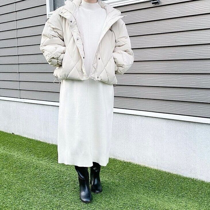 膨張しがちな白のコーディネート。じつはダウンで取り入れるとメリハリ感が出せて◎。モコモコしたダウンに、スッキリとしたニットワンピースを合わせると立体的なシルエットに。着用している「ODORATA(オドラタ)」の「ダイヤキルトショートジャケット」はキルティングカットが大きく、直線的なシルエットを描きます。