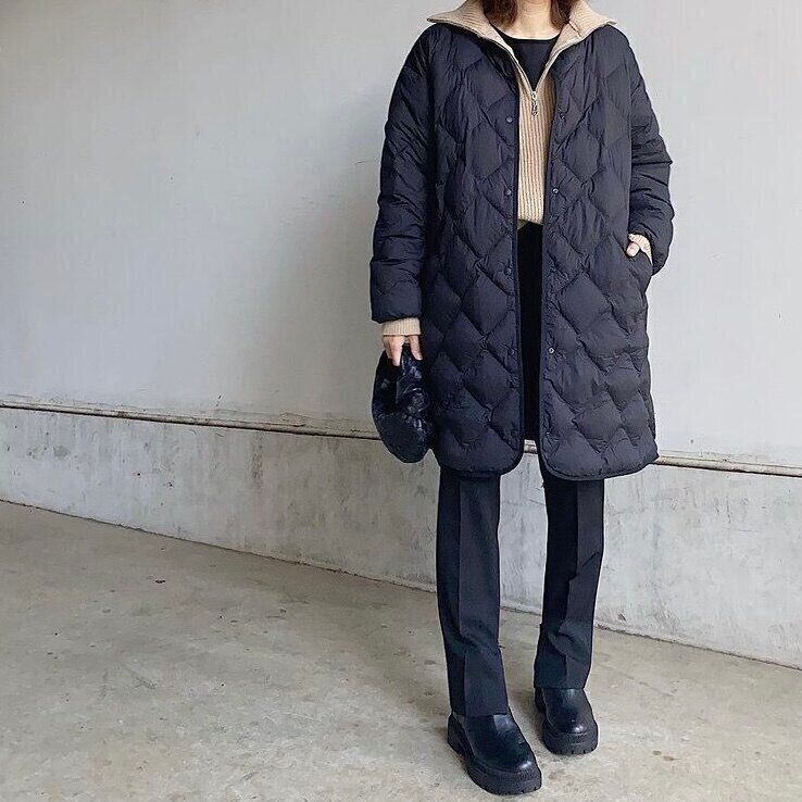 ミドル丈でヒップまで暖かく過ごせるのがユニクロの「ウルトラライトダウンリラックスコート/7,990円」。雨水をはじく耐久撥水機能が加わり、急な悪天候にも対応。スッキリとしたノーカラーのデザインをいかして、襟つきのニットをちょこんと出すと素敵です。