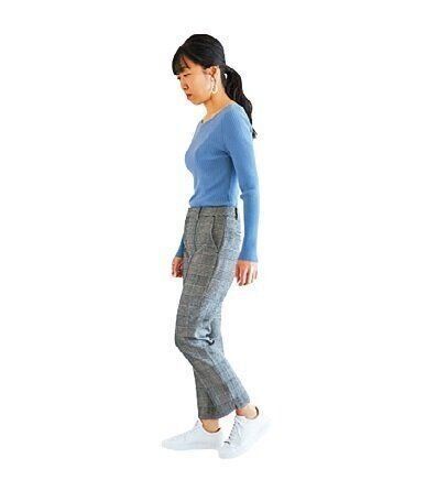 「立つときは、肩を下げて、太ももの内側をくっつけて下腹部を引き上げるのを意識。こうすると骨盤が立ってお尻も引き上がります」。