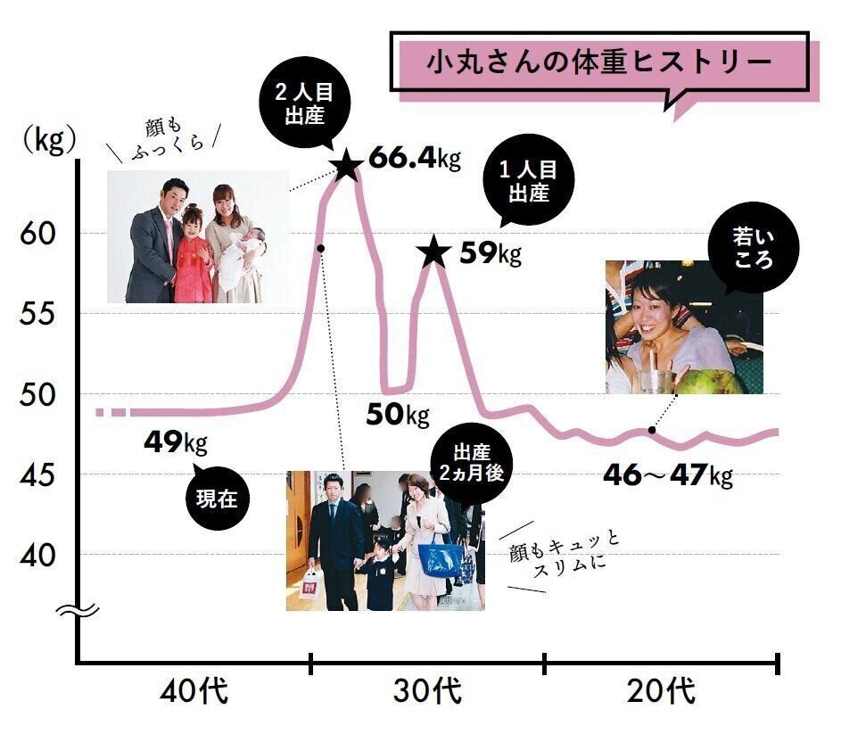 若いころは体重46~47kgを維持していたという小丸さん。体重が増えたのは妊娠・出産がきっかけ。