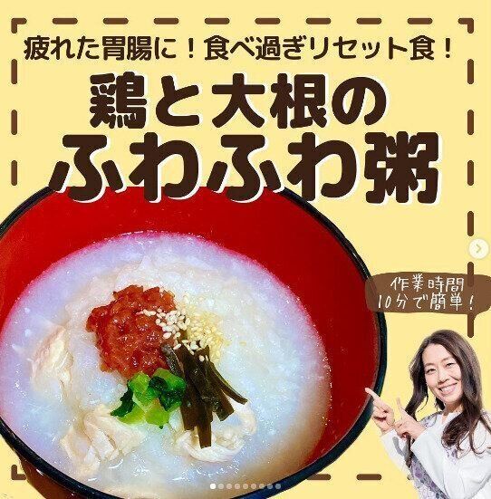 食べすぎてしまうことはだれにでもあるもの。そんなときのために、体にやさしいメニューを覚えておきましょう。こちらは「鶏と大根のふわふわ粥」です。