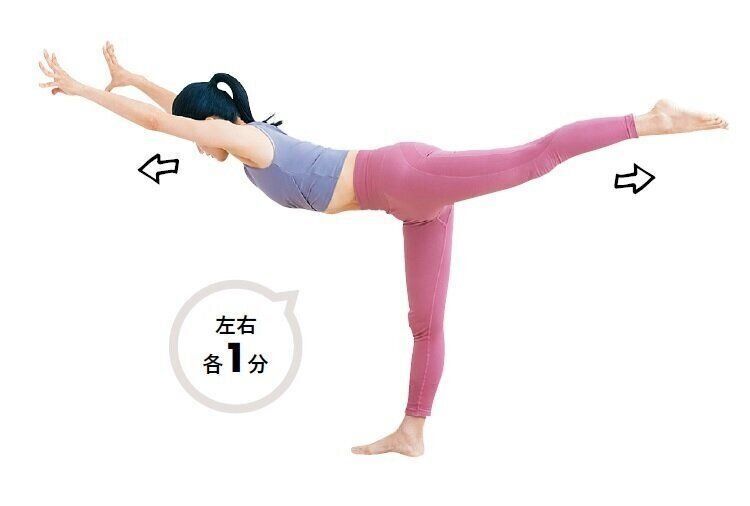 左足を床と水平に上げ、手で壁を押す力と左足を伸ばす力が引き合うのを感じながら1分キ