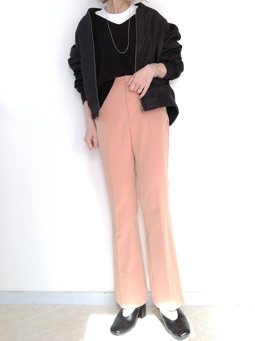 くすみピンクのカラーパンツで、見た目から春らしさを取り入れてみては?辛口なブルゾンを合わせることで、甘く見えがちなピンクも大人っぽい印象に。