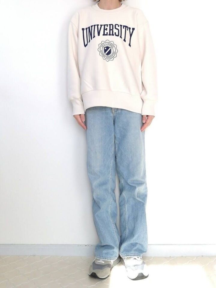 GUの「カレッジロゴスウェットプルオーバー(長袖)RS」を使ったコーディネートと着こなしのコツをご紹介しました。