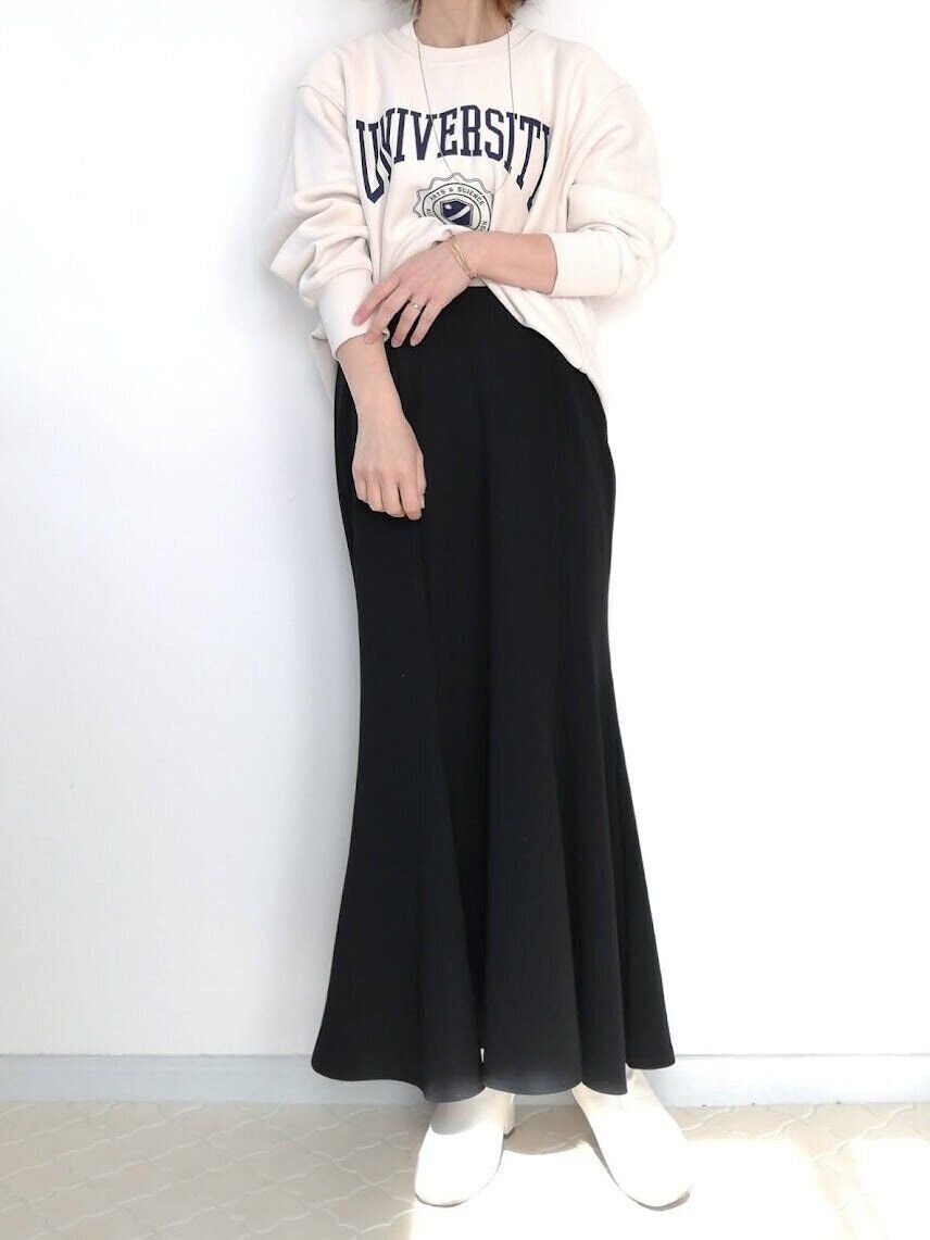 マーメイドスカートは女らしすぎる気がしてちょっと恥ずかしい……というかたは、カジュアルなロゴスウェットを合わせてみるのがおすすめ。